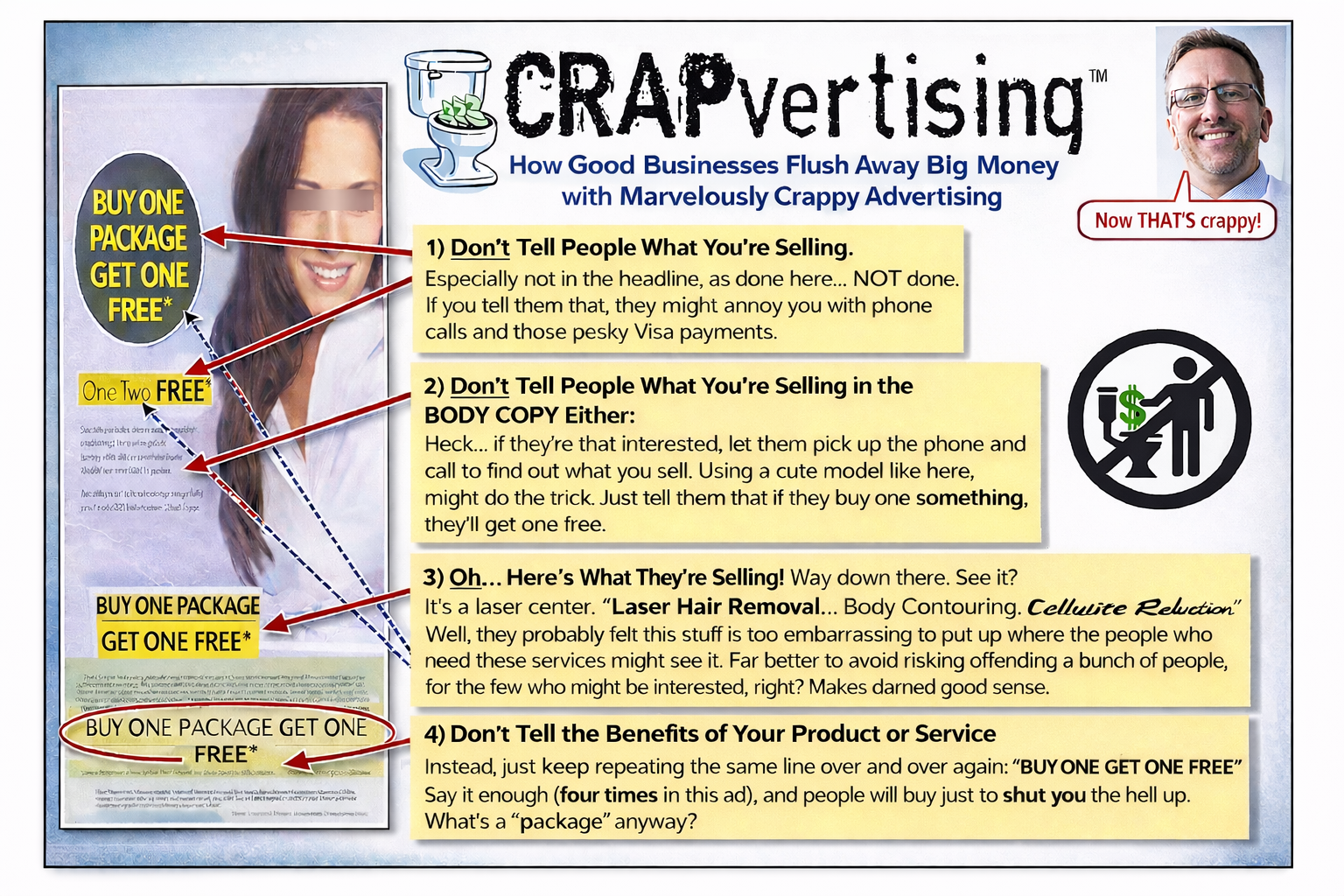 FLUSH! That’s the sound of perfectly good marketing dollars being washed away by CRAPvertising.